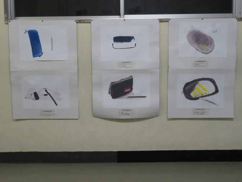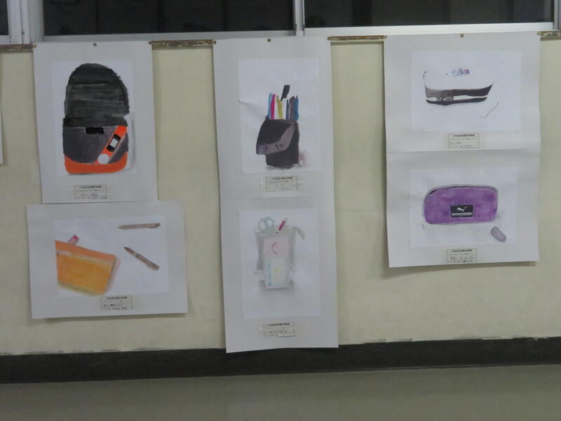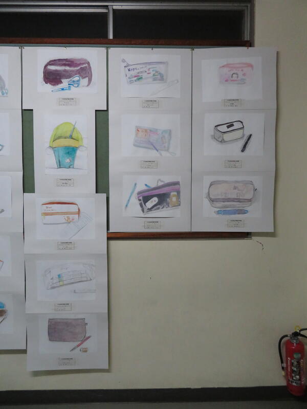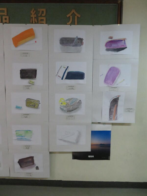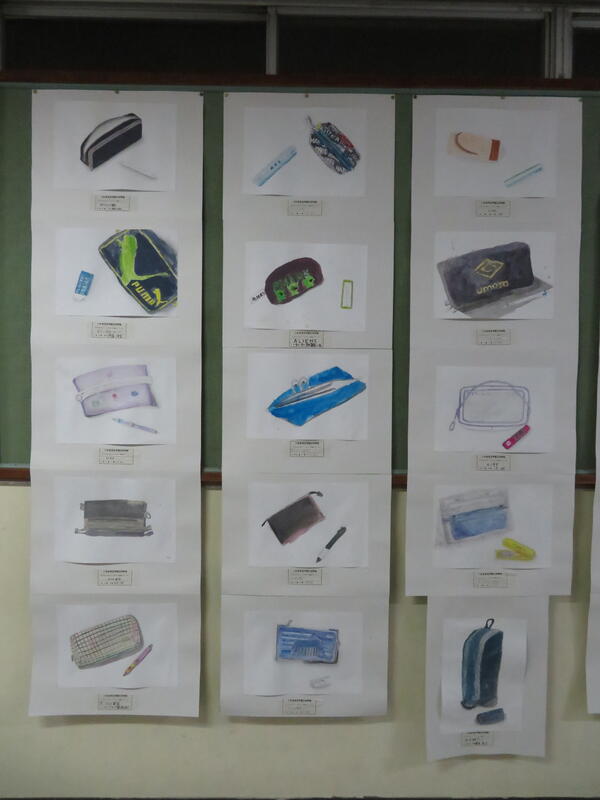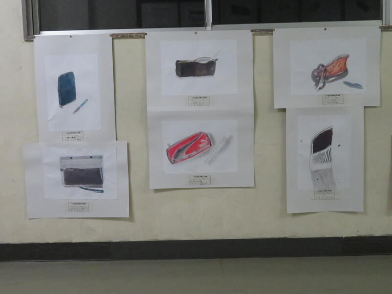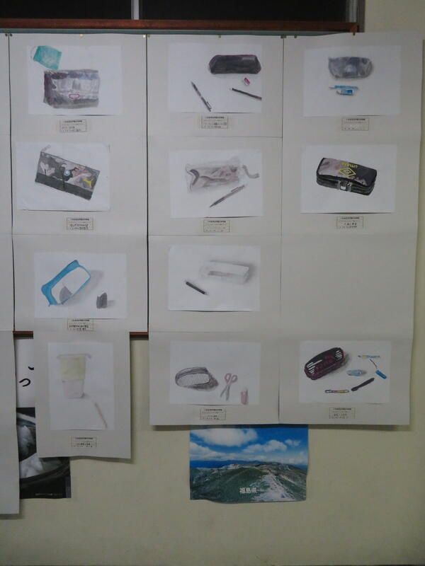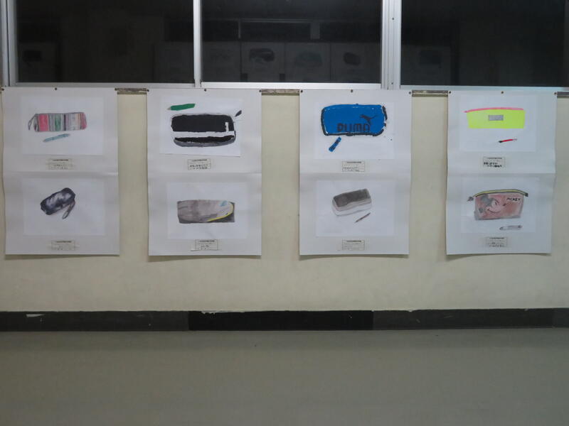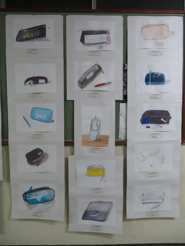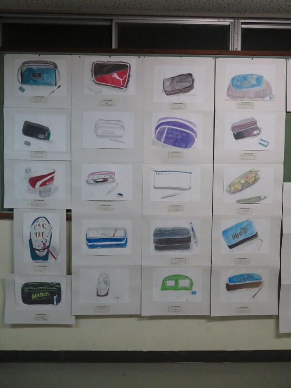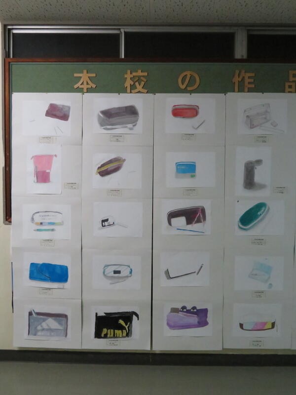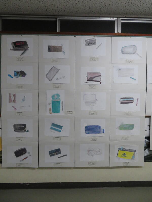 題材は「見つめると見えてくるもの ~筆箱のスケッチ~」です。普段使っている同じような筆箱を描いているのですが、作者によって表現は様々です。個性が出ていますね。1年生のみなさんは、見つめた結果、何が見えてきたのでよう?