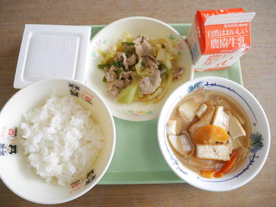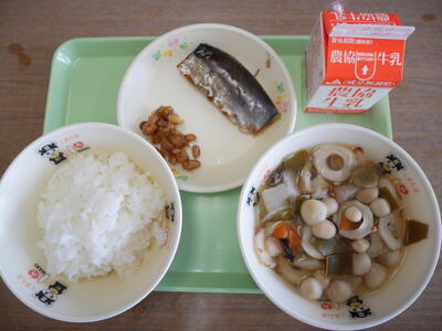 2025年2月7日 13時49分今日の給食の献立は、ごはん、牛乳、納豆、豚肉とキャベツのみそ炒め、のっぺい汁です。(一汁二菜こんだて)