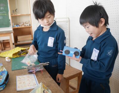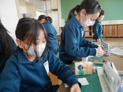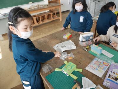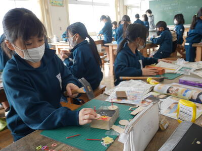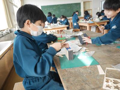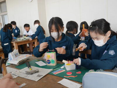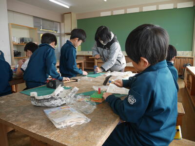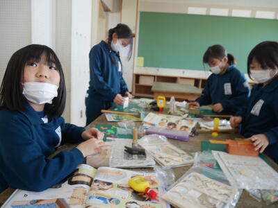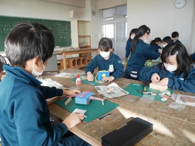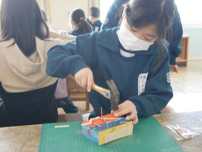 2025年1月31日 11時33分3年生が図工室で、真剣な表情をしながら、色をぬった木にくぎをどんどん打っていました。