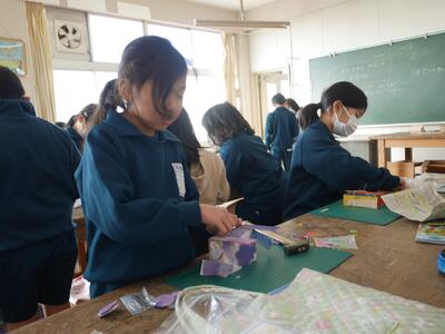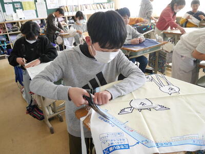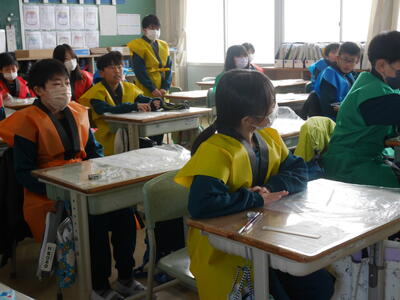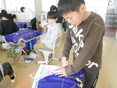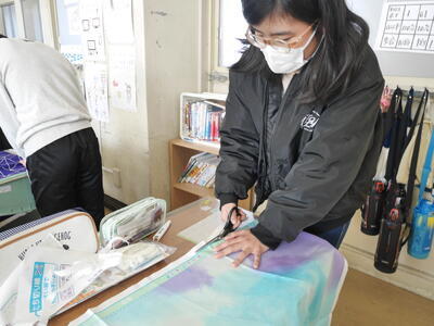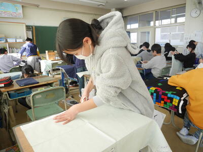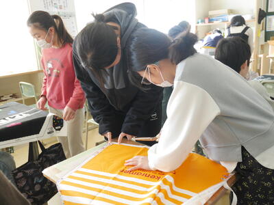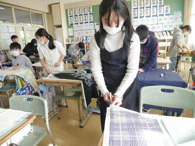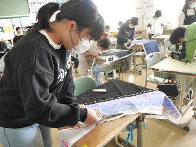 2組は、家庭科でエプロンづくりに取り組んでいました。