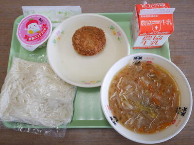 2025年1月31日 12時01分今日の給食の献立は、みそかけうどん(そふとめん・みそかけ汁)、牛乳、かぼちゃコロッケ、豆乳いちごパンナコッタです。