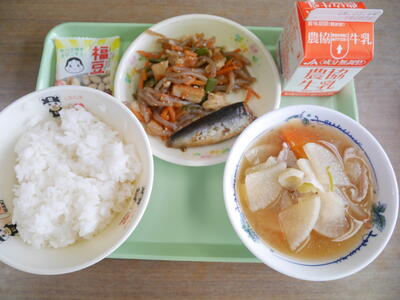 2025年2月3日 15時46分今日の給食の献立は、ごはん、牛乳、いわしのうめに、こんにゃくのきんぴら、豚汁、ふく豆です。