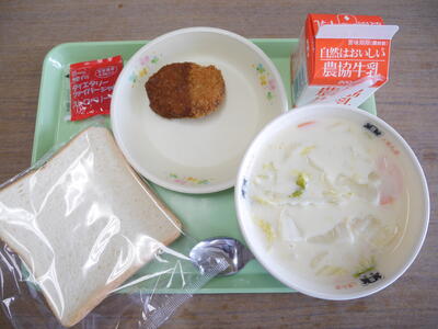 2025年2月5日 15時09分今日の給食の献立は、食パン、いちごジャム、にんじんメンチカツ・ワインソースかけ、白菜のクリームスープです。