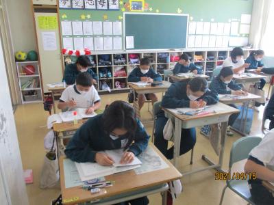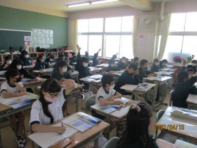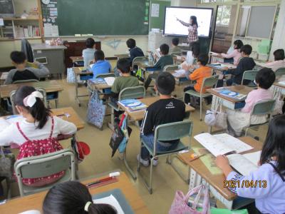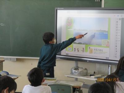 5年生の理科の授業のようすです。天気の変化をテーマに学習していました。子どもたちは、2枚の写真を比較して、晴れと曇りの違いについて話し合っていました。