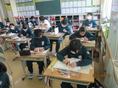 6年生の算数の授業のようすです。対称な図形をテーマに学習していました。子どもたちは、点対称な図形の性質について調べていました。