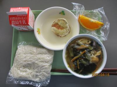今日のこんだては、きつねうどん、牛乳、さつまいもの天ぷら、オレンジでした。
