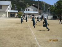 6年生の体育の授業のようすです。校庭で体ほぐしの運動に取り組んでいました。子どもたちは、晴天の下で体を動かし、汗をかき        ながら、体をならしていました。