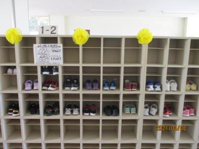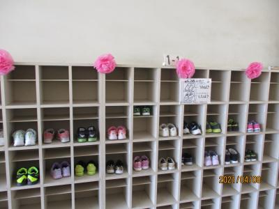 1年生の下駄箱のようすです。全員のくつがきれいに並んでいました。入学して三日目、とてもすばらしい。感心しました。