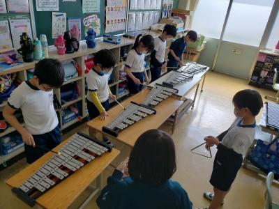 トライアングル、鉄琴、木琴、鈴などを演奏しました。