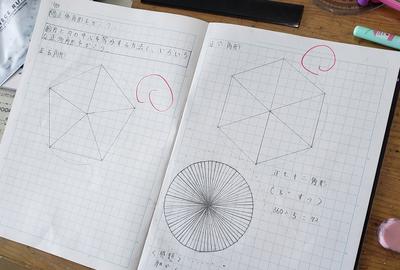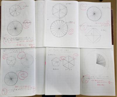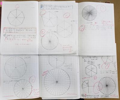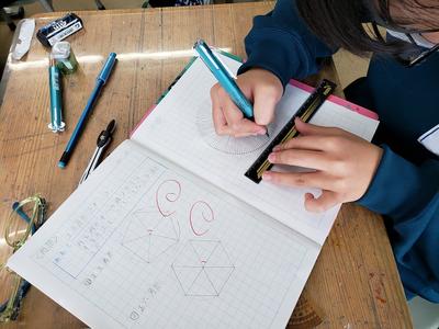 円を利用し、円の中心周りの角を等分する方法で正多角形をかく学習をしました。