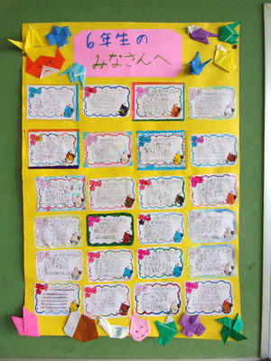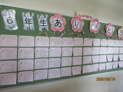 2020年3月18日 12時20分6年生のみなさん、卒業の日まであと少しですね。4月から1年間、1年生のお世話をしてくれて、ありがとうございました。6年生と別れるのはとても寂しいです。感謝の気持ちが、少しでも伝わるように、メッセージを書きました。2年生から5年生のメッセージも順次アップしていきます。