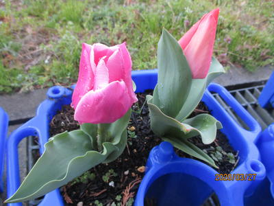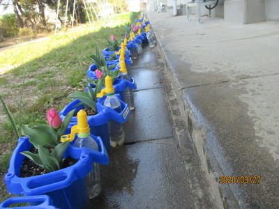 2020年3月27日 07時47分一年生が育てたチューリップの花が咲き始めました。