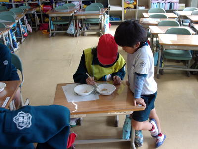 まず始めに、絵カードの中から自分が食べたいと思うおやつを選びました。そして、おやつの量は、約200キロカロリーであることを教えていただきました。ポテトチップスでいうと、約35グラムだそうです。子ども達がいつも食べているという量を量ってみると・・・48グラムとちょっと多かったみたいです。自分で選んだおやつは何キロカロリーかも確かめました。また、おやつは食事の2時間前までにとると、食事をおいしく食べられることも教えていただきました。