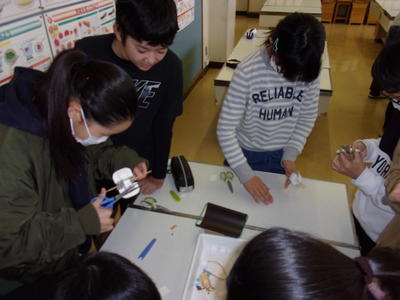 2019年12月7日 11時09分12月7日土曜日、6年生は自然エネルギー教室の学習を行いました。今回で三回目で最後の教室でした。「さかのぼり水車」の作成をグループ毎に行いました。最後の競争に向けて、どうしたら早くさかのぼれるのか、安定して走るにはどうしたら良いかなど、活発な話し合いを行うことができました。三回にわたり、いわき環境研究室のみなさん、福島高専の先生と生徒のみなさん、平窪自然塾のみなさん、ご協力いただきありがとうございました。