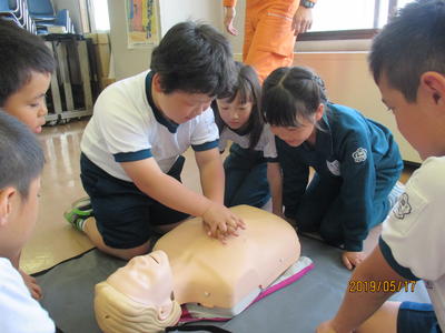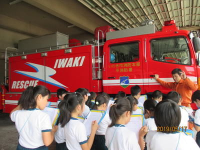 4年生は平消防署に行きました。消防署では、設備や人命救助訓練見学と、救急救命の体験を行いました。子どもたちは、胸骨圧迫の仕方やAEDの使い方を学び、貴重な体験をすることができました。消防署の都合で1日遅れの遠足になりましたが、前日には、学区内にある、防火用水や緊急避難場所を確認をすることができました。