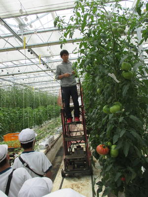 ビニールハウスの中を見せていただき、トマトの育て方についてお話を聞きました。家庭や学校でトマトを育てた時とは異なる栽培方法に、子どもたちは興味津々でした。