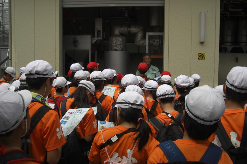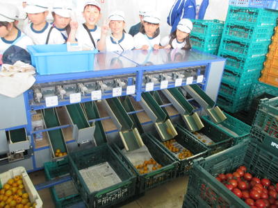 選果作業の様子も見せていただきました。子どもたちは、様々な仕事をする機械に興味をもって見学しました。