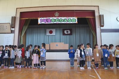 花のアーチをくぐり、6年生と手をつないで1年生が入場しました。6年生の代表委員が中心となってこの会を準備してきました。