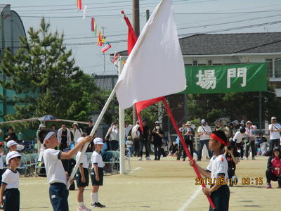 今年度は、開始時刻を例年より30分遅らせて、9時から入場行進が行われました。1年生の元気な挨拶から開会式がスタートしました。