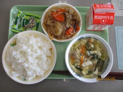 2021年4月8日 16時41分今日のこんだては、ごはん、牛乳、マーボー春雨、中華たまごスープ、抹茶だいず でした。