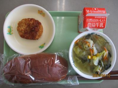 2021年4月12日 12時52分今日のこんだては、黒糖パン、牛乳、コロッケ・ワインソースかけ、野菜スープでした。