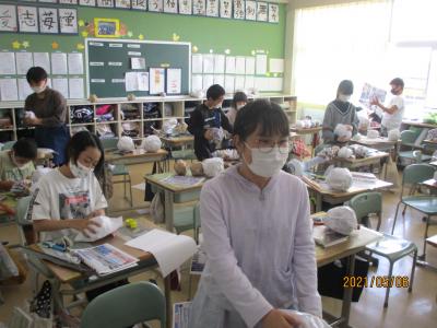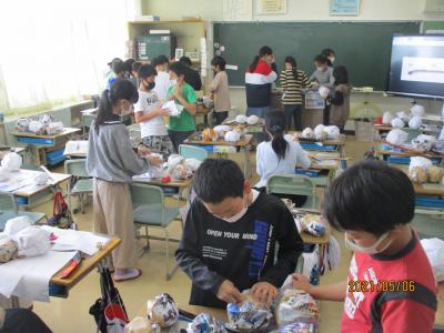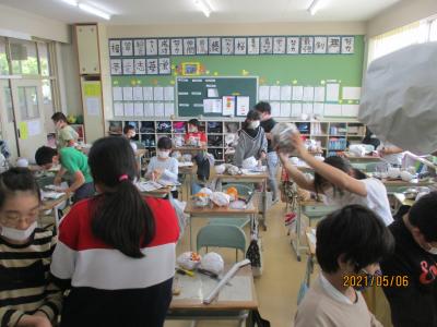 2021年5月6日 15時10分6年生の学級活動のようすです。運動会を成功させようをテーマに活動していました。子どもたちは、団体種目で使う「命玉?」を作っていました。