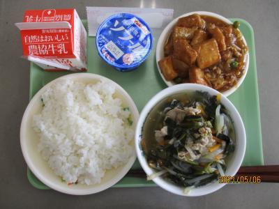 2021年5月6日 15時16分今日のこんだては、ごはん、牛乳、マーボー厚揚げ、ワンタンスープ、ヨーグルトでした。