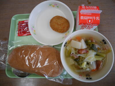 2024年10月16日 11時31分今日の給食の献立は、コッペパン、いちごジャム、牛乳、かぼちゃコロッケ、ポトフスープです。