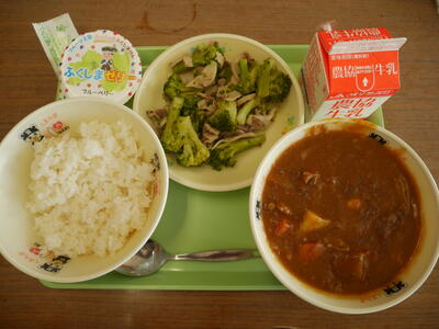 2024年11月11日 11時47分今日の給食の献立は、ふくしま牛カレーライス(発芽米入りごはん)、牛乳、ブロッコリーとエリンギのソテー、福島ブルーベリーゼリーです。