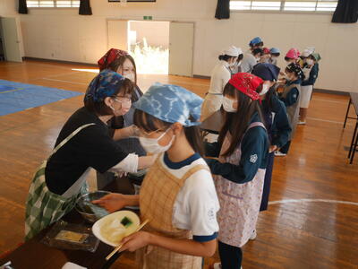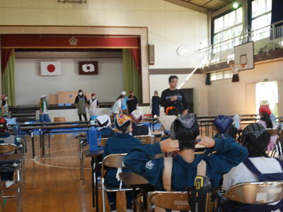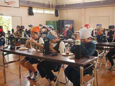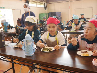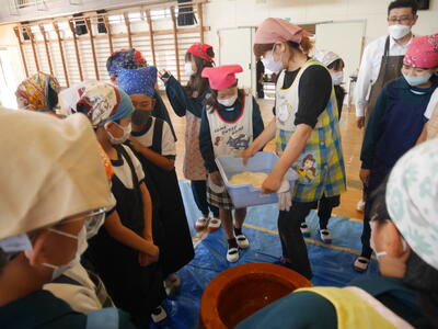 2024年11月12日 12時37分保護者の皆さんに手伝っていただきながら、5年生が学習田で収穫したもち米で、餅つきをしました。
