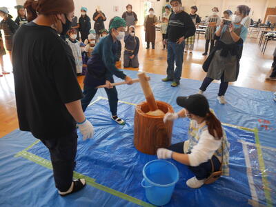 順番にきねをもって餅をつきました。PTA会長さんが仕上げをして完成です。