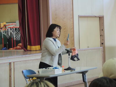 2~4校時にかけて図工室で各学級ごとに行い、けん玉のいろいろな技についてや、けん玉をするときに大切なことなどについて話していただきました。その後、実際にけん玉を使って、けんの持ち方を教えていただき、けんのいろいろな場所に玉を載せてバランスを取ることに挑戦しました。また、大皿、中皿,、小皿に載せたり、ろうそくやとめけんの技にも挑戦したりしながら、本気になって楽しく活動しました。最後には、山木さんにとても難しい技も見せていただき、子どもたちもとても喜んでいました。