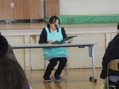 はじめに書写関係の表彰を行い、福島県書きぞめ展で「書きぞめ準大賞」を受賞した児童と、いわき市小学校児童書写展覧会で「特選」を受賞した児童の表彰を行いました。二人とも、線の美しいすばらしい作品を書いての受賞となりました。