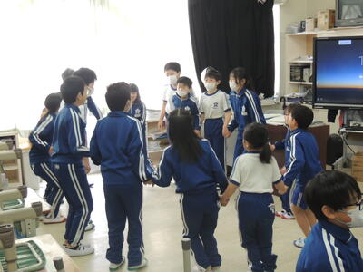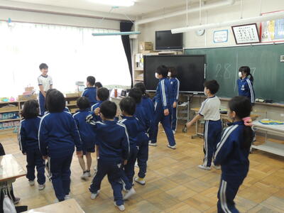 1年生は6年生と一緒に「しろくまジェンカを踊ろう!」