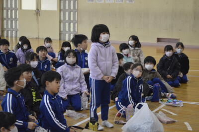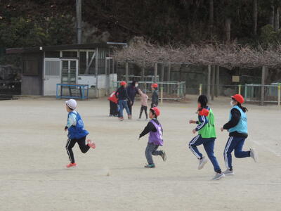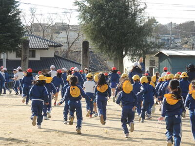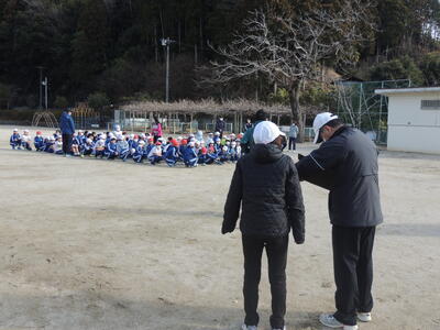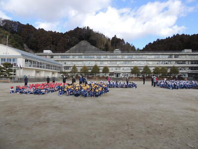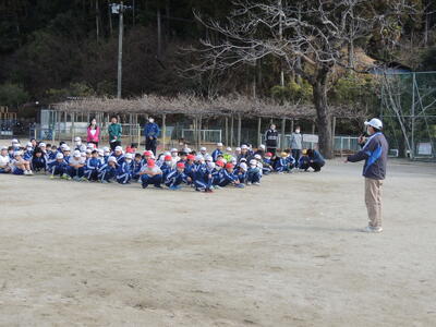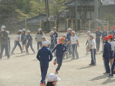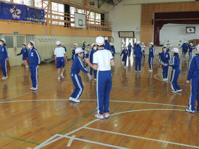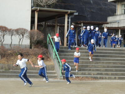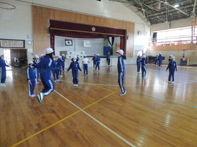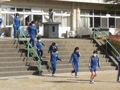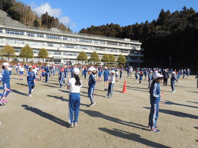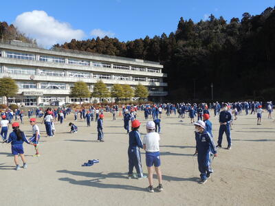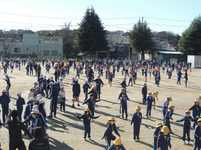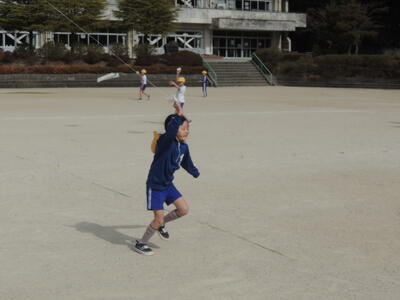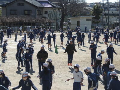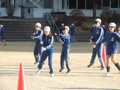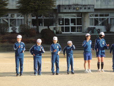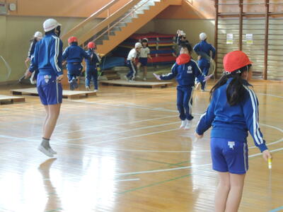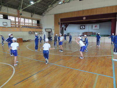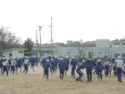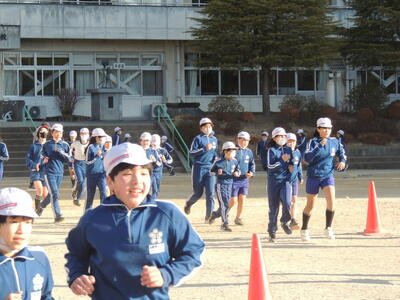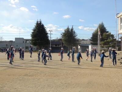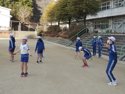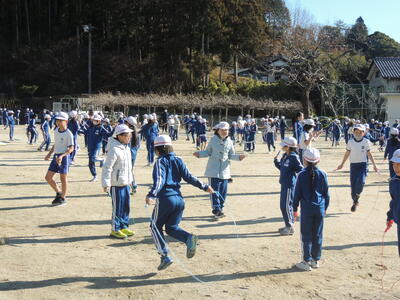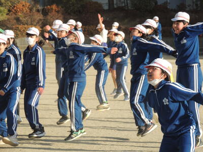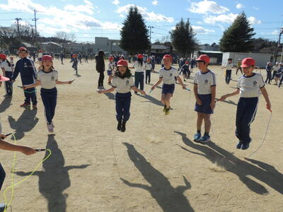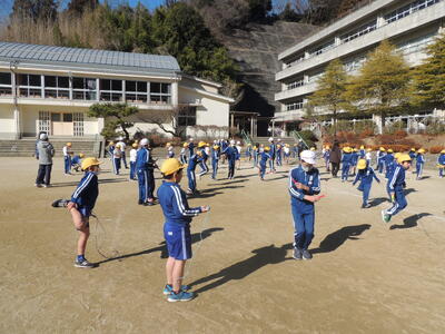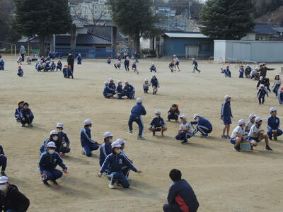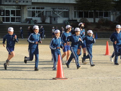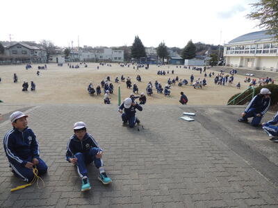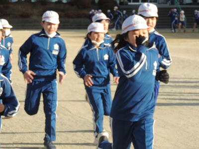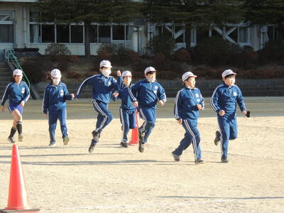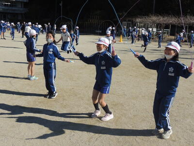 5年生は、毎朝10分間ほど、体力作りに取り組んでいます。校庭の4か所に分かれて、はじめになわとびを行い、その後、ジャンプや腕振り、体を動かしながらのランニングなどにを行っています。寒さに負けずがんばって取り組んでいます。