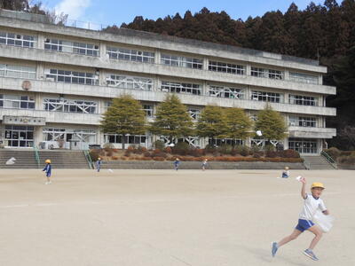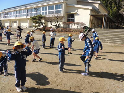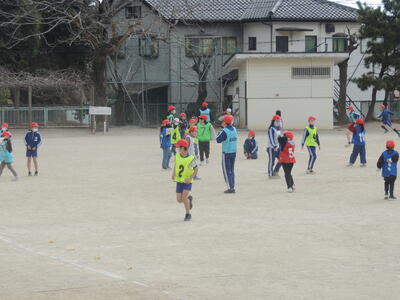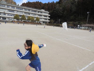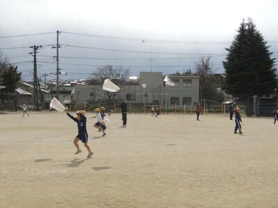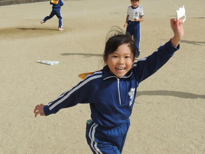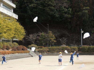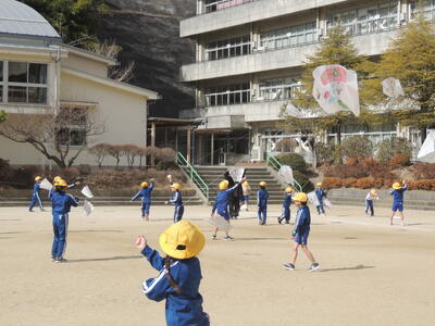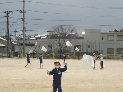 1年生が生活科「ふゆをたのしもう」の学習で、「たこあげ」を行っています。5日(木)の4校時は1年2組と3組が元気にたこあげを行いました。