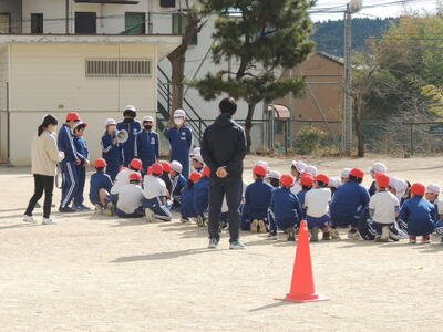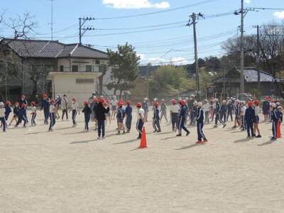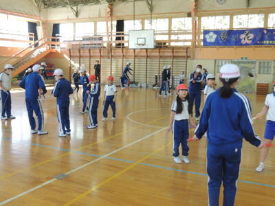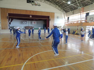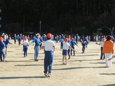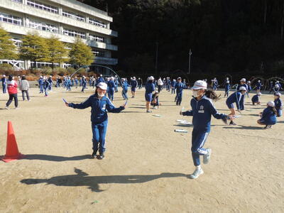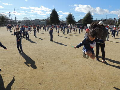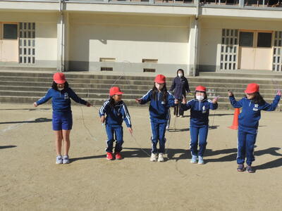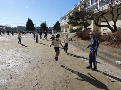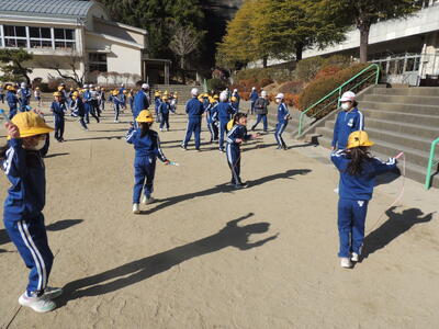 校庭を、1・6年生、2・5年生、3・4年生のゾーンに分け、「五竜なわとびチャレンジカード」をもとに、それぞれなわとびの練習をがんばりました。上級生が下級生と一緒になわとびをしたり、跳び方を教えたりする姿も見られ、お互いに交流しながらなわとび運動に取り組んでいました。