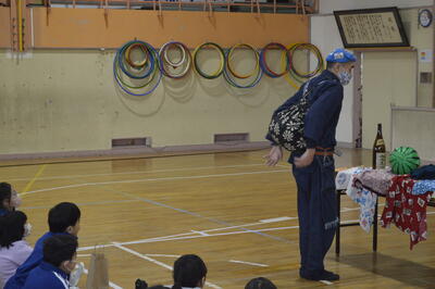21日(火)の2,3校時に「呉服處 根本」の店主 根本紀太郎さんにおいでいただき、3年生対象に「風呂敷作法講座」を行っていただきました。