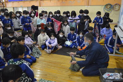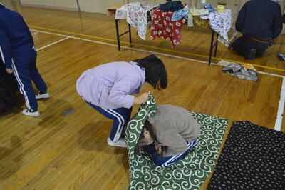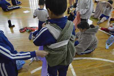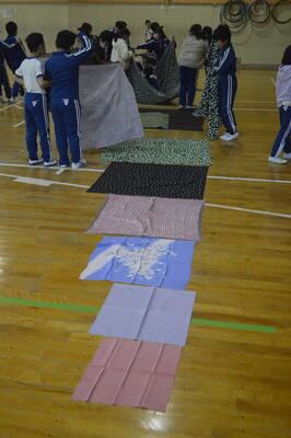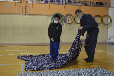 風呂敷の大きいものでは、大人の人も包める大きさの風呂敷もあることを聞いて、実際に人を包んでみる体験も行いました。