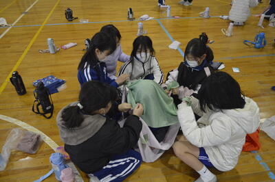 風呂敷の結び方では、ひとつ結びや真結びの結び方を知り、三角形バックや四角形バックを作りました。