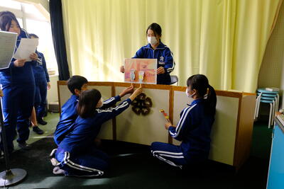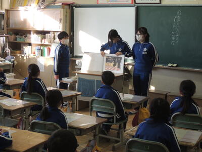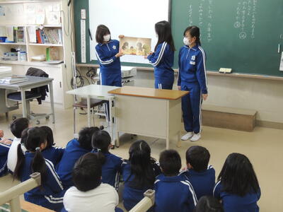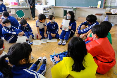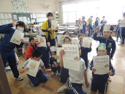 これは、6年生が朝や大休憩の時間に、下級生に勉強を教えたり、読み聞かせをしたり、一緒に遊びや運動をしたり、ポスター作りや校庭・校舎の掃除をしたりと、班ごとに自分たちでどんな活動が良いか考えて、感謝の気持ちを込めて行うボランティア活動です。