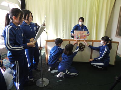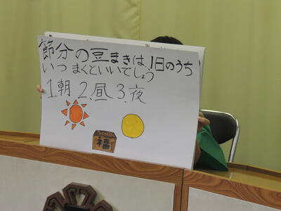 始めの言葉、校長先生の話、集会委員長あいさつがあり、その後、集会委員会からペープサートでの節分のお話と、節分クイズが行われました。