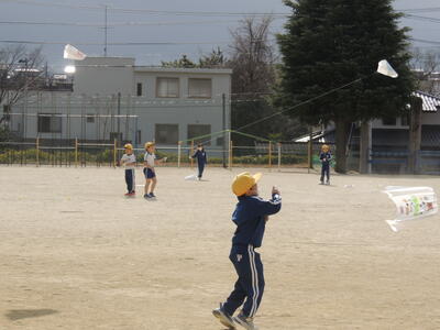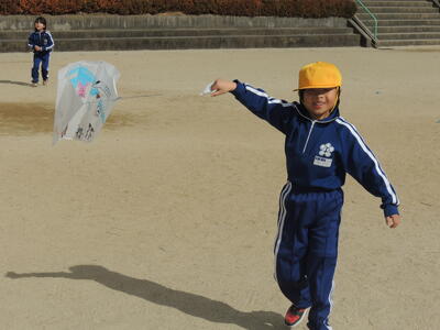 自分で絵をかいた「たこ」をもって校庭に出てきて、思い思いにたこあげに挑戦しました。走りながら凧をあげたり、うまく風をとらえてたこをあげたりと、とても楽しそうにたこあげを行いました。