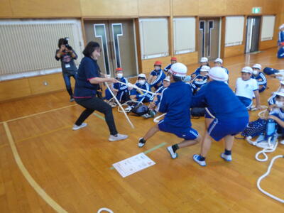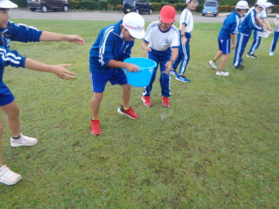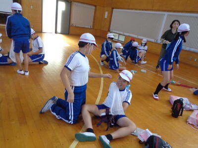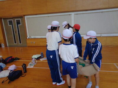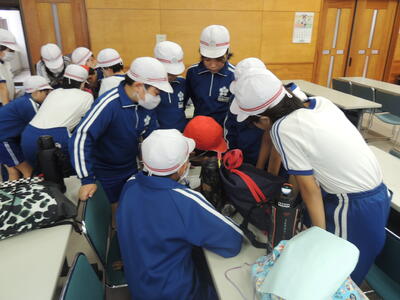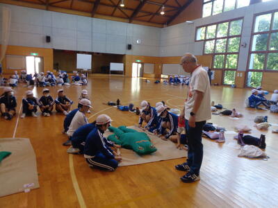 ◆午後は、防災プログラムを行いました。「応急手当ワークショップ」「持ち出し品なあに?クイズ」「なまずの学校(防災カードゲーム)」「ロープワーク」「毛布で担架タイムトライアル」「バケツリレー」「新聞スリッパ」など、災害時に必要な知識や行動の仕方などについて、班ごとにいろいろなコーナーを体験しながら学習しました。