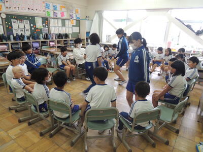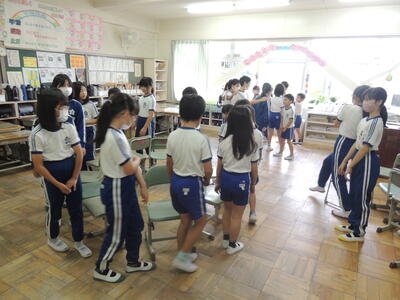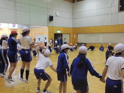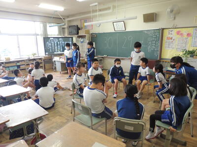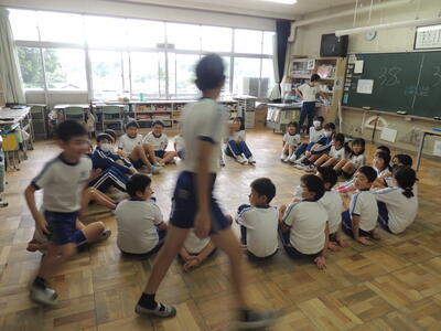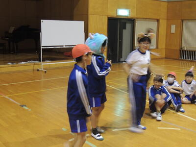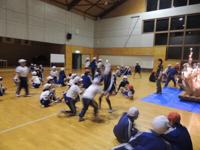 各班ごとに遊ぶ内容を決め、フルーツバスケットやいす取りゲーム、カルタ取り、ハンカチ落としなどで楽しみました。また、同じ教室の2つの班が一緒に風船バレーをして楽しむところもありました。