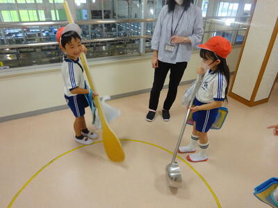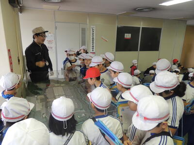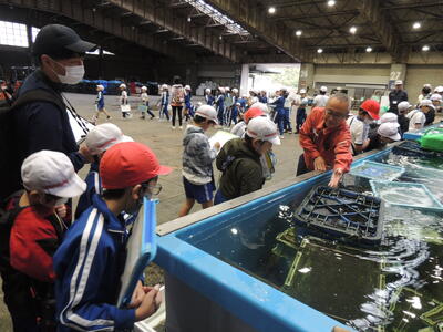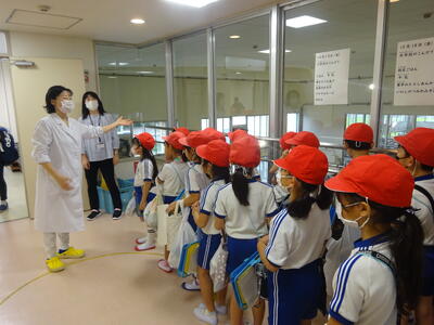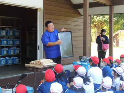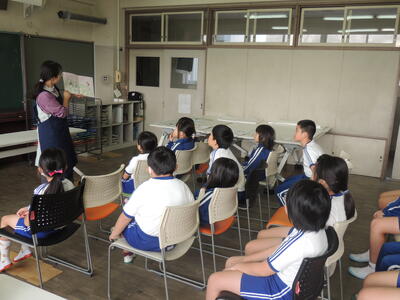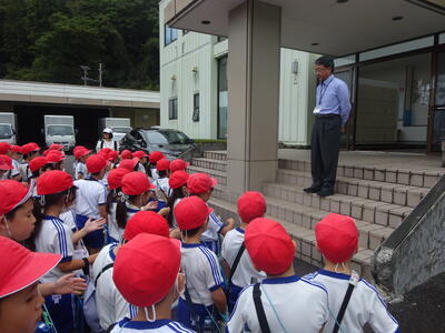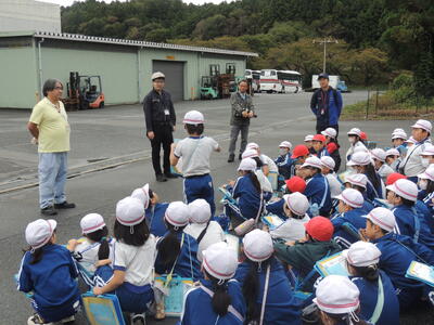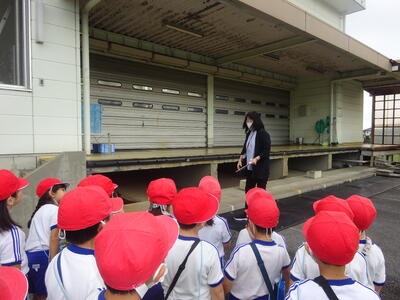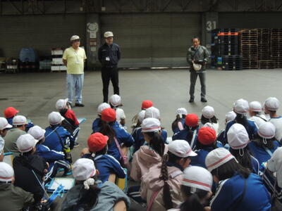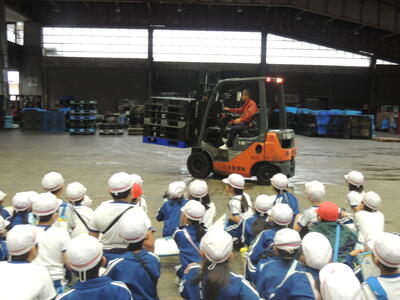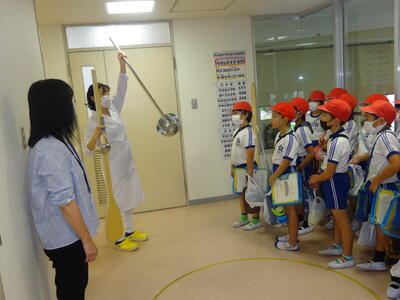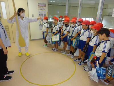 平南部給食調理場では、平方部の小中学校のうち、約3300人分の給食を作っています。調理場の様子を見学し、実際に使用している大きな道具を持たせていただいてかき混ぜるまねをしたり、働く人の1日の仕事内容について分かりやすく紙芝居で見せていただいたりして、子どもたちは大満足で見学をすることができました。