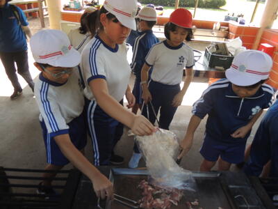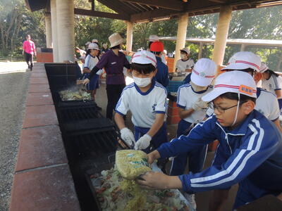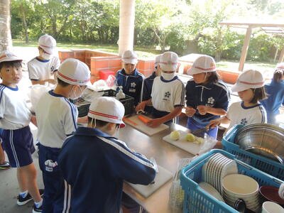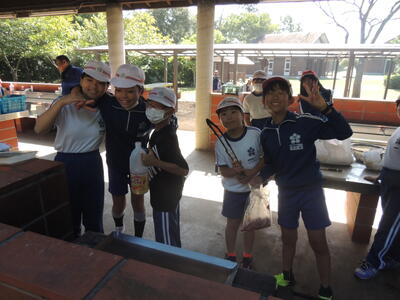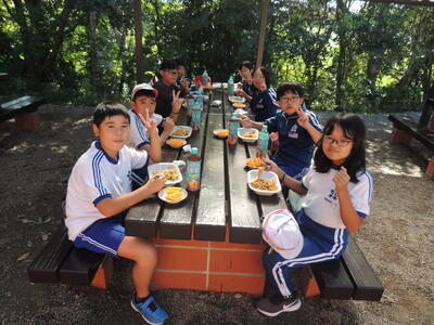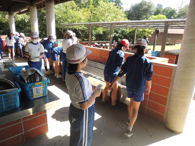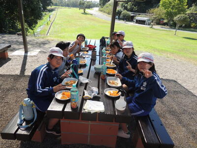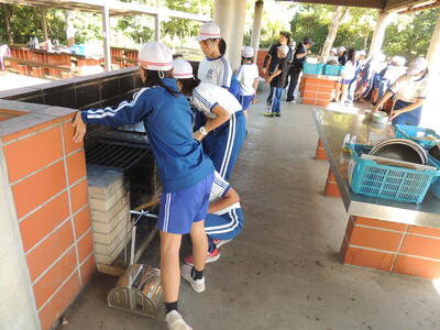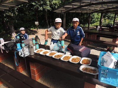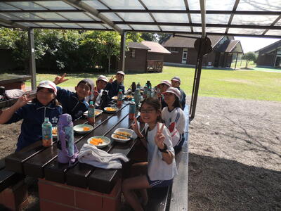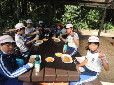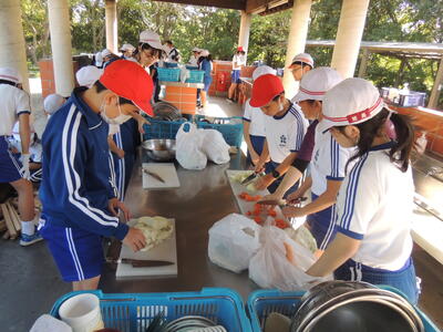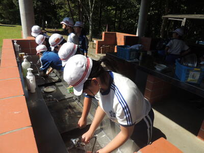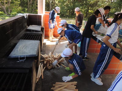 ◆2日目の午前中は、野外炊飯です。野外炊飯場に移動し、自然の家の所員の方から説明を聞き、各班ごとにやきそば作りに挑戦しました。野菜を切る係、薪を取りに行って火をおこす係、食器を準備する係など班ごとに協力し合って調理を進めました。火も上手におこすことができ、やきそばもおいしくできました。片付けも分担・協力しながら短時間で行い、「来たときよりも美しく」片付けを行うことができました。