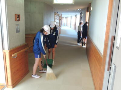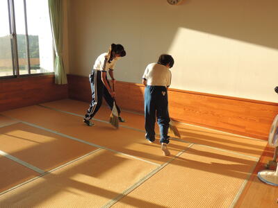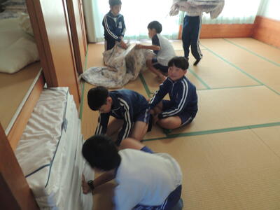 ◆朝、食事前に部屋の片付け、清掃を行いました。ふとんもきれいにたたんで元の場所に戻し、それぞれ分担した清掃場所をきれいにしました。