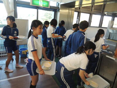 ◆朝食。本館での最後の食事でしたが、笑顔も多く見られおいしくいただきました。片付けの後、食事を作ってくださった方々に班ごとにお礼を言って感謝の気持ちを伝えました。