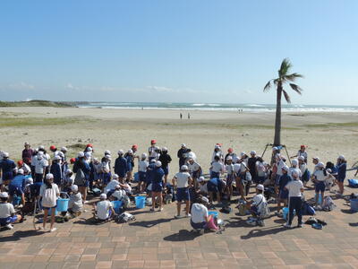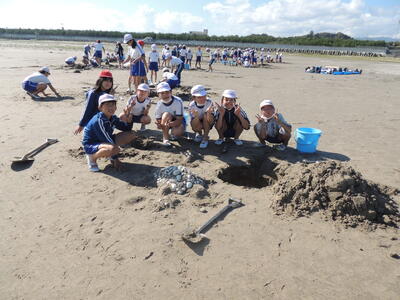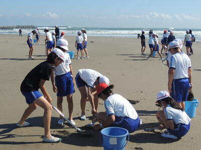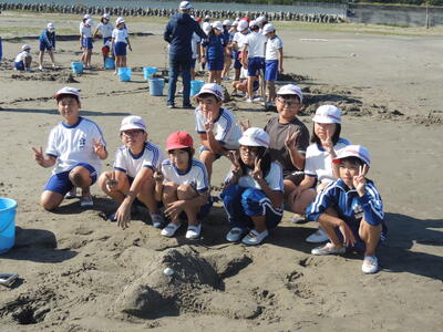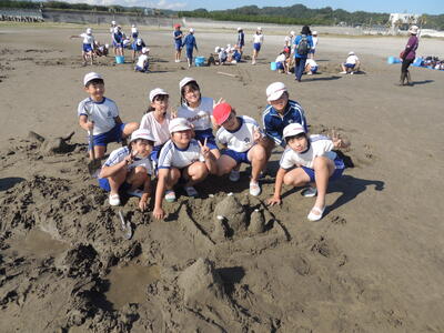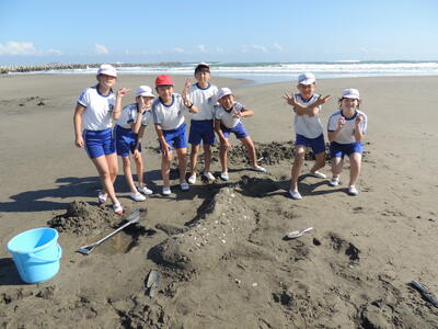 ◆2日目の午後は、バスで四倉海岸に移動し、「砂の芸術」を行いました。各班ごとに、スコップやシャベルで砂を掘り、思い思いに砂で作品を作りました。